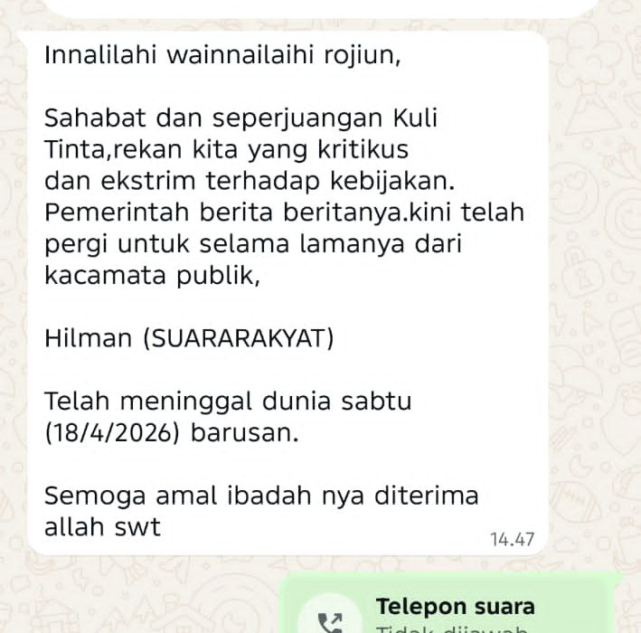 HOAXApril 18, 2026 Hilman Suara Rakyat Dikabarkan Wafat, Padahal Hoaks: Sosok yang Kerap Bongkar Kasus Diduga Jadi Sasaran Teror Informasi.