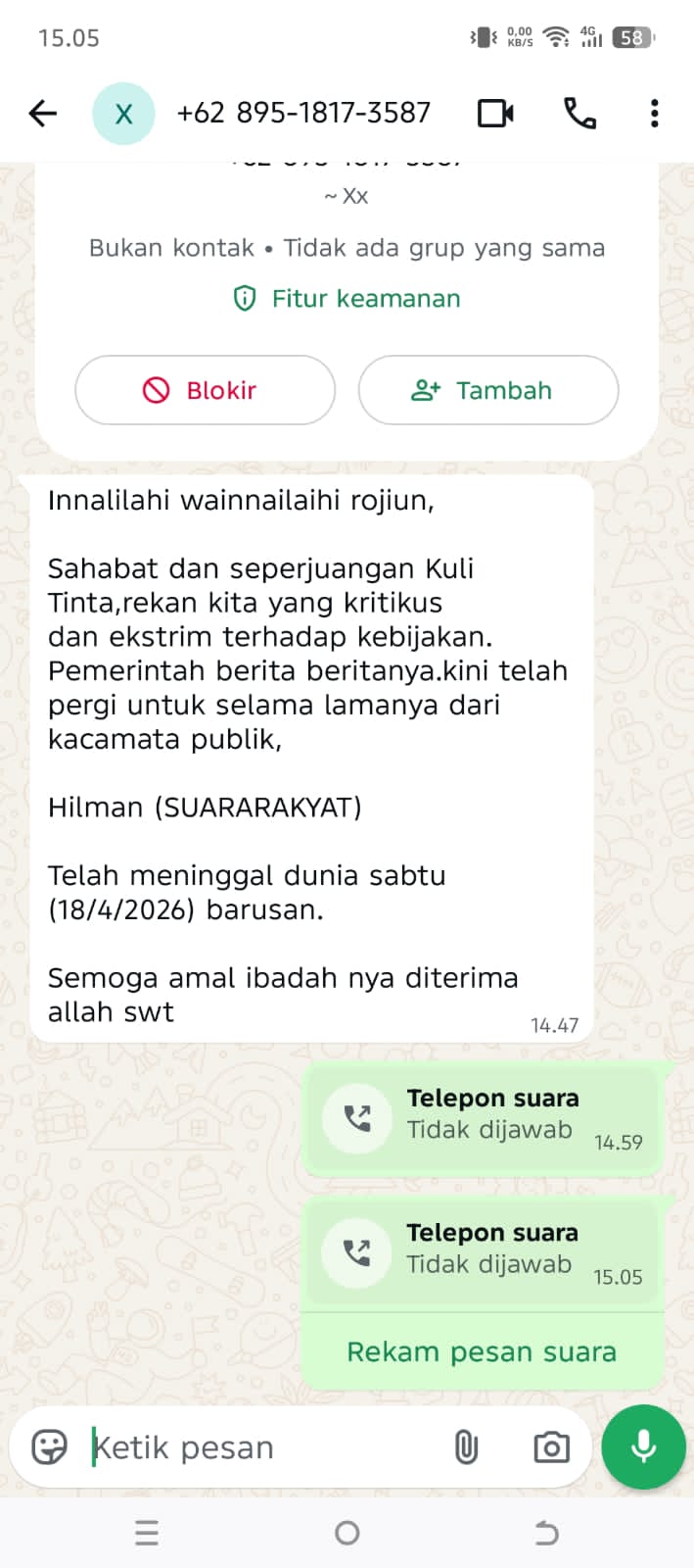 3Hilman Suara Rakyat Dikabarkan Wafat, Padahal Hoaks: Sosok yang Kerap Bongkar Kasus Diduga Jadi Sasaran Teror Informasi. RedaksiApril 18, 2026